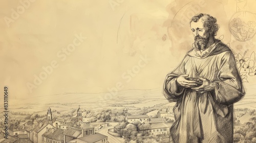 Fototapeta premium St. Vincent de Paul Serving the Poor in 17th-Century France, Biblical Illustration, Beige Background, Copyspace