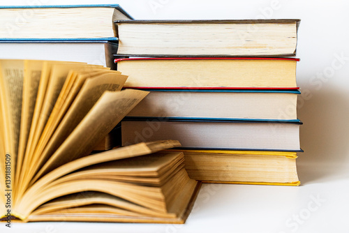 © anastasiia, Obraz premium stack large pile of printed literary old books lies on table book covers and pages for study book pages and bindings on white background mountain of books