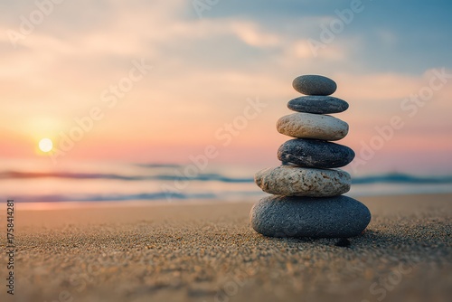 © Rachmedia, Fototapeta premium Stack of Balanced Stones at Beach Shoreline during Sunrise with Calm Ocean Background