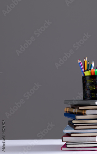 Fototapeta premium Stack of books and notebooks with pencil container on top and copy space on grey background