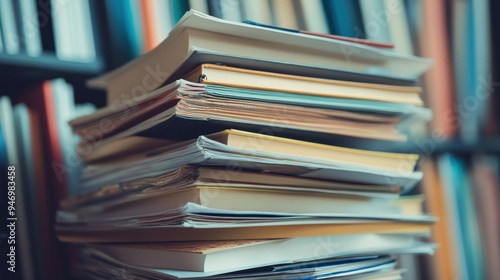 © Rere_Art151, Obraz premium Stack of Books and Papers on a Bookshelf