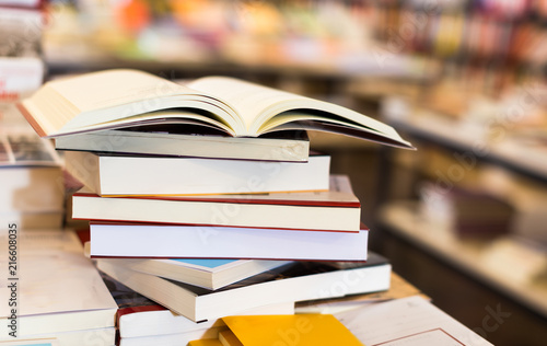 © caftor, Naklejka premium stack of books lying on table in bookstore