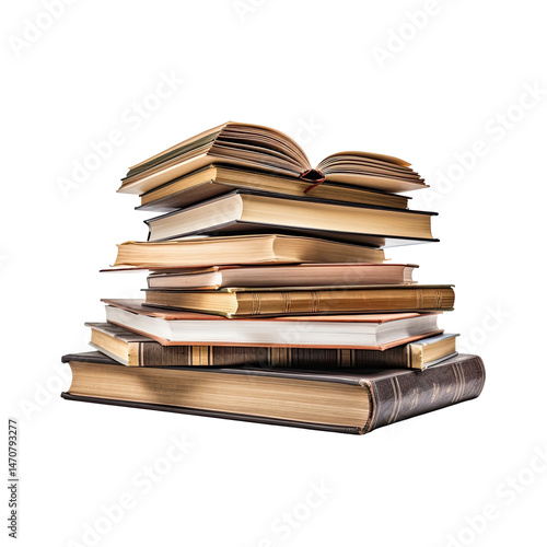 Obraz premium Stack of Books with Open Book and Flipping Pages on Transparent Background