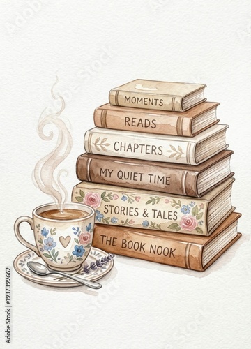 © Natalia, Naklejka premium Stack of Books with Steaming Coffee Cup and Floral Design