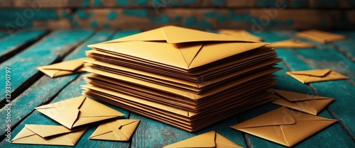 © GenZGraphics, Obraz premium Stack of brown envelopes on a rustic wooden table, showcasing organized stationery for correspondence or creative projects.