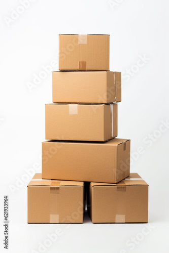 © tiena, Fototapeta premium Stack of cardboard ail boxes on a white background. AI generated
