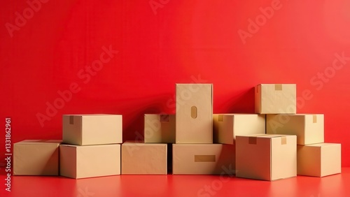 © Angel Pic, Obraz premium Stack of Cardboard Boxes Against Vibrant Red Background, Ideal for E-commerce, Delivery, and Shipping Concepts