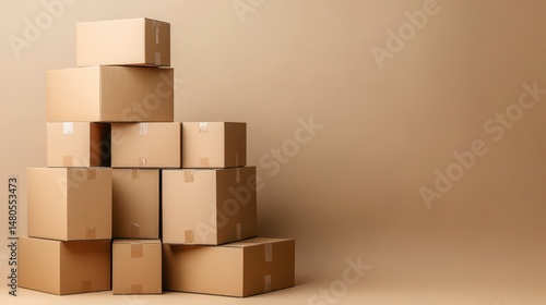 Fototapeta premium Stack of cardboard boxes on beige background.