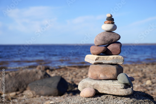 © MaskaRad, Fototapeta premium Stack of colorful pebbles balancing on a rock by the sea