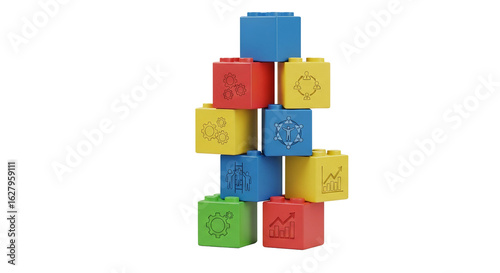 © Toqeer, Obraz premium Stack of colorful toy building blocks with business icons isolated PNG with Transparent Background