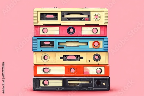 Fototapeta premium Stack of Colorful Vintage Cassette Tapes on Pink Background