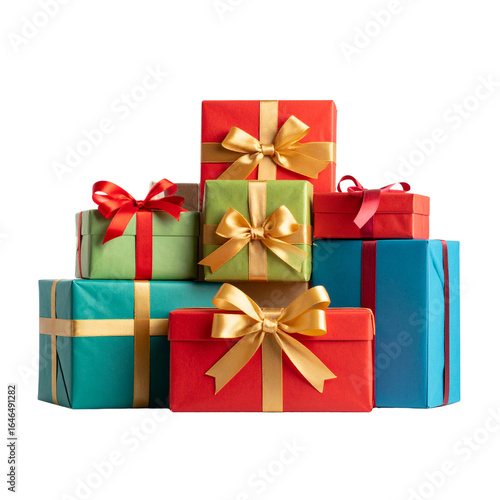 © MDJAKIRUL, Obraz premium Stack of colorful wrapped presents with decorative bows, transparent background PNG