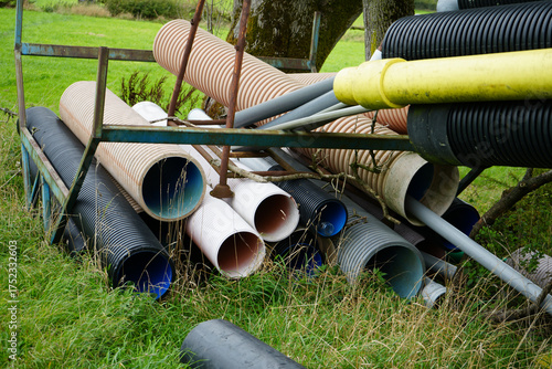 © The Nott'm Lass, Fototapeta premium Stack of corrugated plastic drainage pipes and other construction materials resting on a rusty metal frame in long grass in Crich Derbyshire England