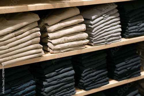 © Wongsakorn, Obraz premium Stack of cotton colorful clothes on table in cloth store.
