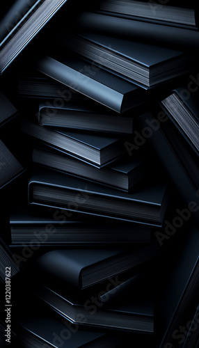 © Anatthaphon, Obraz premium Stack of dark-colored books creating abstract pattern in artistic arrangement.