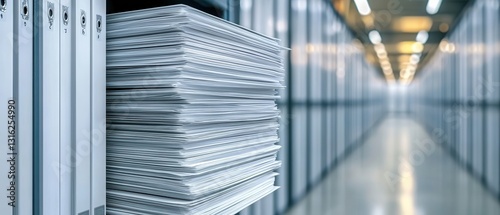 © Sasiwan, Obraz premium stack of documents is neatly organized in modern archive room, showcasing efficient storage solutions. well lit corridor emphasizes importance of document management in professional setting