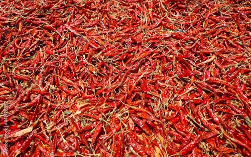 © Arnav, Fototapeta premium Stack of Dry Red Chilies in Sunlight in Horizontal Orientation, Perfect for Background