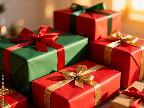 © rfassets, Obraz premium Stack of Festive Christmas Gifts with Warm Bokeh Lights