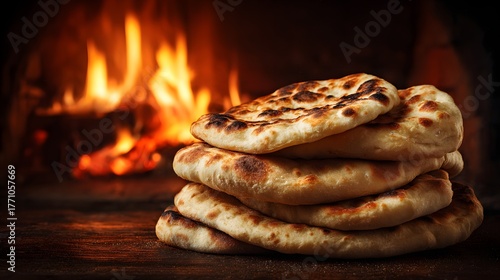 © Jojo*, Obraz premium Stack of freshly baked flatbread rests before a roaring, warm fireplace