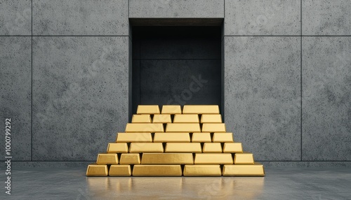 Obraz premium Stack of gold bars against a modern concrete wall.