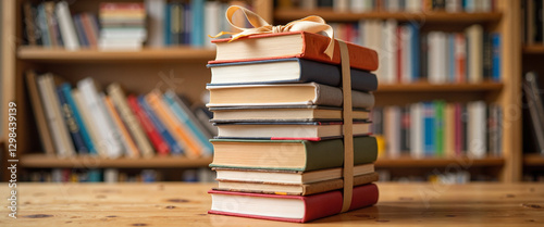 Obraz premium Stack of hardcover books tied with ribbon on wooden desk, knowledge and...
