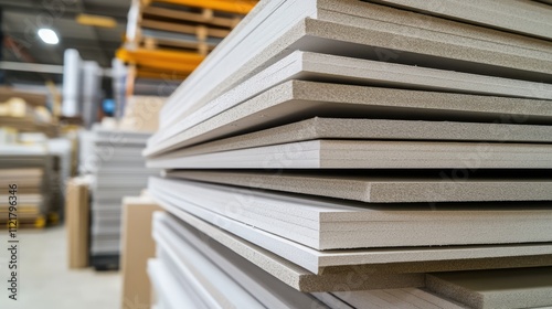 © AImmersive Imagery, Obraz premium Stack of high-quality sound-insulated gypsum boards for construction, ideal for indoor concrete wall applications in hardware stores.