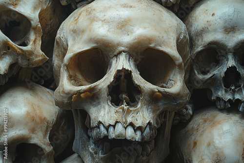 © Vilius, Naklejka premium Stack of human skulls and bones in a haunting, dark atmosphere. Perfect for horror, Halloween, and death-themed visuals.