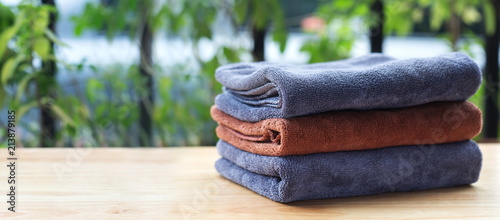 © abimagestudio, Obraz premium Stack of microfiber cloth on table with copy space.