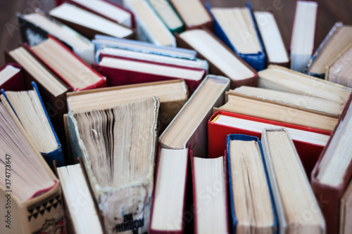 Fototapeta premium stack of old book, education concept background, many books piles with copy...