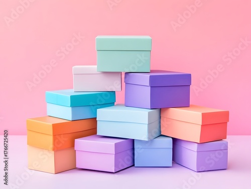 © salman912, Fototapeta premium Stack of pastel colored gift boxes on pink background