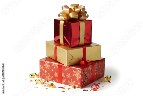 Obraz premium Stack of Red and Gold Christmas Gift Boxes Isolated on White Background