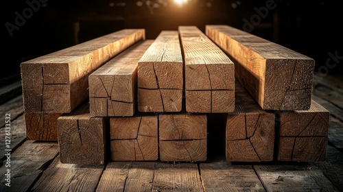 © Chaithat, Obraz premium Stack of Rough Hewn Square Timber Workshop Woodcraft Indoor Close-up View Craftsmanship and Texture