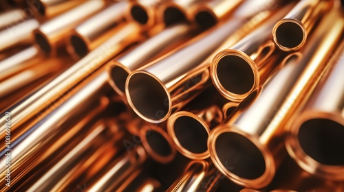 Naklejka premium Stack of Shiny Copper Pipes Industrial Metal Material Texture High...