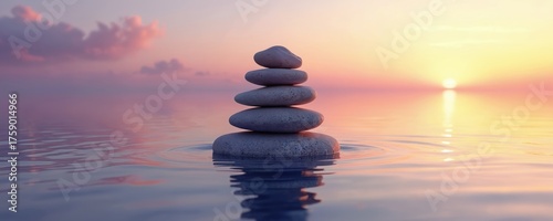 © Viktor, Fototapeta premium Stack of smooth stones balanced on calm water surface at sunrise. Pastel sky and sun reflection create serene peaceful mood. Zen pebble tower.