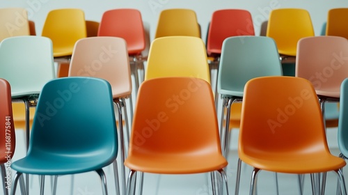 © Rabiyah, Fototapeta premium Stackable plastic chairs, arranged on white background for practical storage solutions