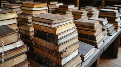© Myxafly, Obraz premium Stacked Antique Books on Wooden Shelves
