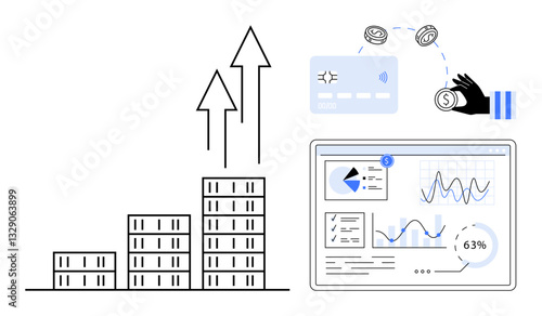 Fototapeta premium Stacked bar graph with upward arrows, analytics dashboard with charts, digital card transfer, hand holding cash. Ideal for finance, business, statistics, digital banking, technology economic growth