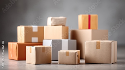 Obraz premium Stacked Brown Cardboard Boxes on Gray Surface Against Blurred Background...