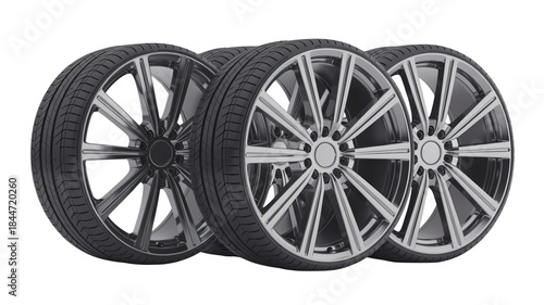 © DrexDesign, Fototapeta premium Stacked Car Wheels with Tires on White Background