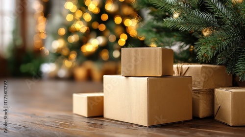 Naklejka premium stacked cardboard box near a bright christmas tree holiday gift box delivery...