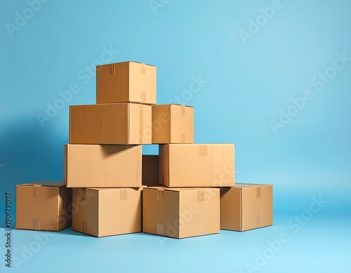 © Rodlotul, Fototapeta premium Stacked cardboard boxes against blue background for delivery or storage concept