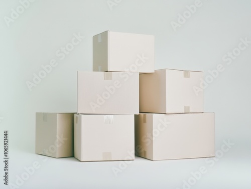 © Ishika, Obraz premium Stacked cardboard boxes on a light background