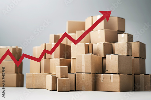 Fototapeta premium Stacked cardboard boxes with a red upward arrow symbolizing growth, business...
