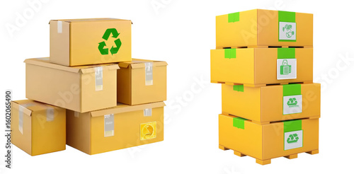 © Pixeloop, Obraz premium Stacked cardboard boxes with ecommerce symbol isolated on transparent PNG image perfect for logistics and packaging visuals