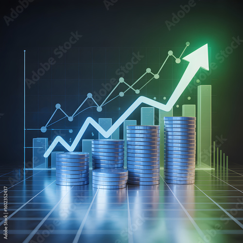 © Afnan, Fototapeta premium Stacked Coins and Financial Growth Graph with Green Upward Arrow