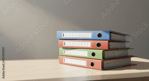 Fototapeta premium Stacked colorful binders on wooden table with natural light