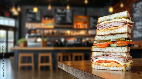 © ikhsan, Fototapeta premium Stacked deli sandwiches cafe background menu