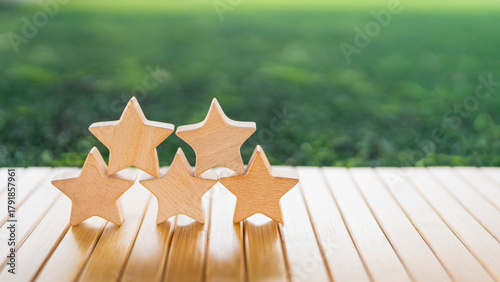 © sommart, Naklejka premium Stacked five wooden stars on table with green background symbolizing high rating, excellent review, top quality, trust, performance ranking, brand credibility, and customer satisfaction.