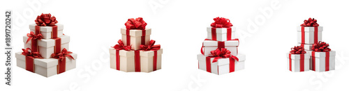 Fototapeta premium Stacked gift boxes with red ribbons and bows in four arrangements isolated on...