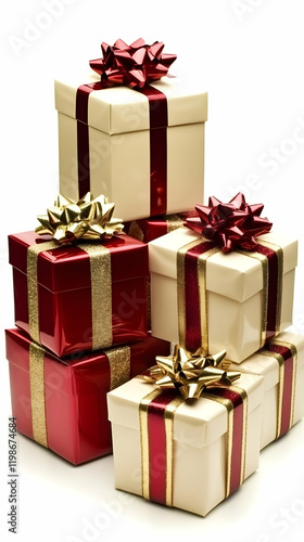 © Siasart, Obraz premium Stacked Gift Boxes with Ribbons and Bows Elegantly Arranged on White Background